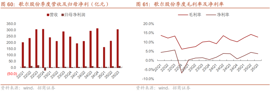 (5)小米:25Q3高端化、全球化持续推进,汽车业务首度盈利。25Q3公司总营收1131亿元,同比 22.3%/环比-2.4%;毛利率22.9%,同比 2.5pct/环比 0.4pct;经调整净利润113亿元,同比 80.9%/环比 4.4%。手机:25Q3毛利率同环比小幅下滑,主要系零部件价格波动及国内市场竞争加剧所致;公司调整25全年出货目标至1.7亿部;成本方面,预计25Q4及明年存储涨价影响仍将持续,公司将从产品结构、库存管理、产业链合作等多角度布局以应对成本压力。IoT:国补退坡等致IoT Q3收入环比下滑,海外IoT业务收入创新高,我们认为短期国补节奏、季节性因素不改IoT业务中长线成长趋势,看好出海长期高成长空间。汽车:Q3经营收益7亿元,9/10月单月交付持续超4万台;我们预计25全年交付将达40万台,购置税补贴影响将于26H1释放完毕,26/27年公司新车发布、进军海外节奏依然稳健,持续打开汽车业务中长线空间。