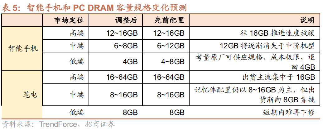 在需求侧,存储价格上涨对于手机和PC BOM压力提升,未来或降规、暂缓升级等应对压力。根据TrendForce,由于预期26Q1存储器价格将显著上涨,全球终端产品面临艰巨的成本考验,智能手机、笔电产业上修产品价格、调降规格,销量展望再度下修已难避免,资源优势将向少数龙头品牌高度集中。26Q1存储在整机BOM的占比将显著提升,不排除缩减或取消旧机降价幅度等措施。对于主要面向中低端市场的安卓手机,2026年品牌商或有上修新机定价动机,同时调整旧机价格或供应周期以减缓亏损。“缩减规格配置”或“暂缓升级”已成智能手机、笔电品牌平衡成本的一项必要手段,其中以成本占比较高的DRAM修正较明显。预料高阶、中阶产品的DRAM容量规格将分别向该市场的最低标准集中,放缓提升速度。至于低阶市场则是受创最深的价格带,以手机为例,2026年退回以4GB为主;低价笔电因受限于处理器搭配及操作系统需求,DRAM配置短期内难再下修。