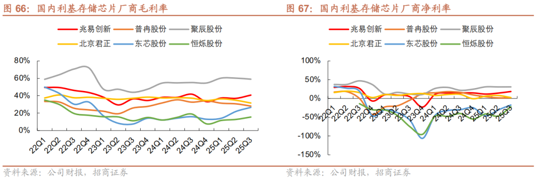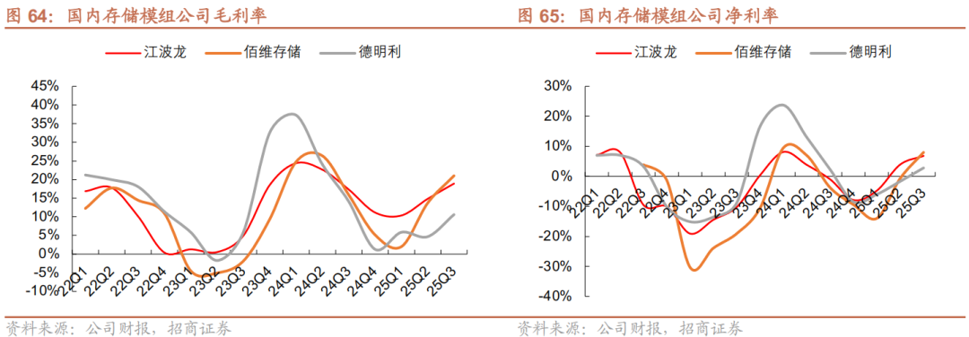 存储模组厂商25Q3毛利率和净利率均环比提升,利润环比扭亏为盈。存储模组厂商主要产品结构为消费级存储,并有少量企业级存储器产品,伴随着消费类需求不景气,各家模组厂商在2024-25H1持续去库存,盈利能力在25Q1-Q2逐步筑底;随着价格尤其是NAND Flash价格在25Q3起全面上涨,各家厂商利润开始逐季释放,展望25Q4整体利润有望同环比加速增长。