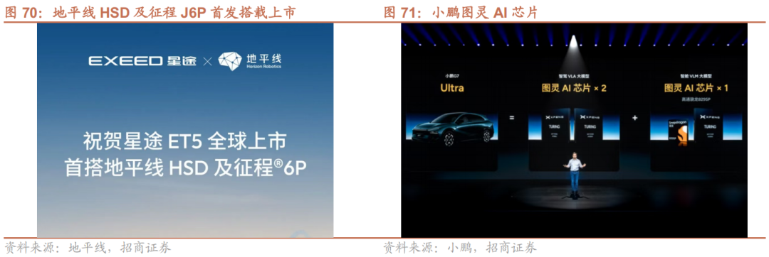 1)地平线机器人:11月首发搭载旗舰芯片J6P及HSD城区辅助驾驶系统的奇瑞星途ET5正式上市,标志着地平线HSD正式开启规模化量产。HSD目前获得国内外多达 10 家车企品牌,超20 款车型的定点合作。2)蔚来:自研5nm高阶智能驾驶芯片神玑 NX9031以替代4颗英伟达 Orin-X,目前已在 ET9、新款 ES6、EC6、ET5 等车型进行搭载;此外据晚点11月报道,蔚来自研高阶智能驾驶芯片神玑系列开始技术外供,向一家汽车芯片公司提供技术授权。3)小鹏:6月小鹏G7 Ultra首发搭载3颗图灵AI芯片,有效算力达2250TOPS;此外小鹏第二代VLA大模型将面向全球商业伙伴开源,11月公司宣布大众汽车成为小鹏第二代VLA首发战略合作伙伴,小鹏图灵AI芯片已获得大众汽车定点。4)小米:公司表示小米汽车芯片正在研发中,后续将很快推出。