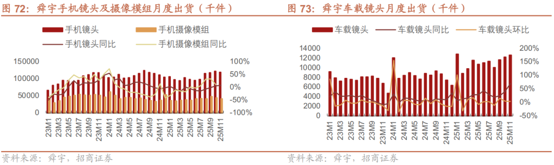 3)舜宇光学科技:手机光学创新趋势持续,车载、XR、机器人发展动能强劲,与歌尔就AR光波导达成合作。1)手机:此前公司预计25年全球智能手机出货量增速同比微增0.2%至11.75亿部,中国市场同比 2.2%至2.84亿部。公司看好小型化、OIS摄像模组、长焦类摄像模组、玻塑混合等的需求增长。北美大客户总体发展情况良好,未来会有更多的业务。2)车载:镜头方面,公司预计2025年全球车载镜头总需求量超过4亿颗,公司25年市占率仍将较24年有所提升。车载摄像模组方面公司起步较晚,目前距离全球第一的13%市占率仍有差距和成长空间,未来将从环境感知拓展到智能座舱、从国内拓展到国际、技术创新等拓展。同时公司看好车载激光雷达应用前景,并积极在机器人和工业领域延伸。3)XR:公司预计2025-2026年MR头显及智能眼镜出货均将突破1000万台,市场初具规模;其中光学作为核心器件,BOM占比约在40%~60%/70%。10月公司与歌尔签署换股合并协议,认购事项完成后,宁波奥来将持有歌尔光学31.31%的股权,成为其第二大股东,有望加快双方微纳光学领域技术进展。4)机器人:公司2014年开始,逐步布局扫地机、无人机、室外配送机器人、清洁机器人、割草机等,并逐步由功能型机器人向具身智能机器人迈进。公司具备视觉传感和机器人整机方案能力,定位由机器人视觉方案提供商向基于视觉的机器人系统方案提供商升级,锚定客户需求进行延伸,目前已拿到超20亿项目订单。