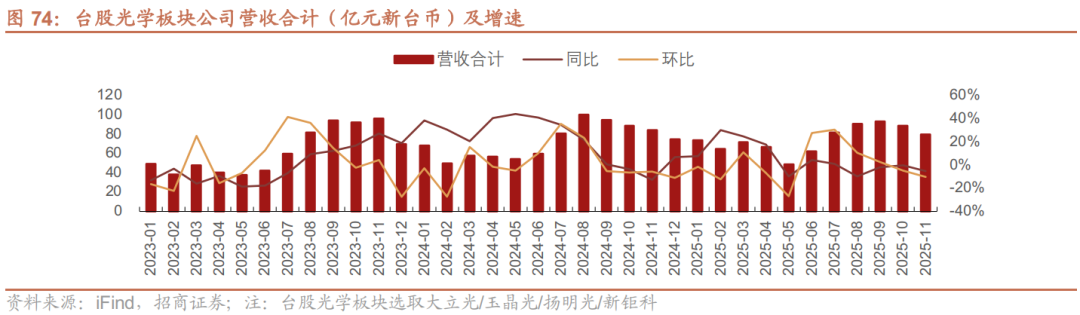 1)中国台湾光学厂商25Q3营收266亿元新台币,同比-4%/环比 49%,25M10营收89亿元新台币,同比 0%/环比-5%,25M11营收80亿元新台币,同比-5%/环比-10%。其中大立光25Q3营收同比-7%/环比 50%,毛利率47.2%环比下滑,主要系外购件增加及汇率影响,25M11营收53亿元新台币,同比-12% /环比-15%,符合公司此前预期11月将较为衰退的预期。公司预计25H2出货量将与往年大致相同,Q4均价将取决于客户拉货结构,需关注良率回升及汇率变动影响。光学升级方面,公司预计26年多光圈及可变光圈将被手机品牌大幅采用,目前可变光圈良率具备挑战。