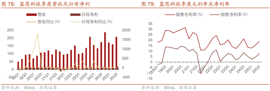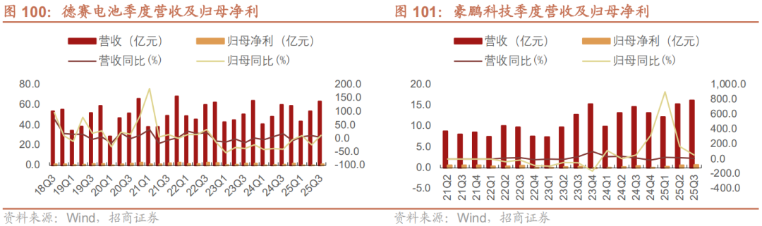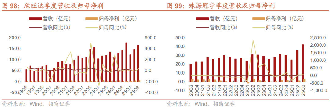 珠海冠宇:公司25年前三季度业绩持续改善,公司作为全球领先的消费类电池厂商,在PC领域全球市占率保持第一,近期在手机领域持续拓展海外大客户并取得积极进展,手机领域市占率稳步提升,在AI可穿戴设备、消费无人机、机器人等领域布局前瞻,呈现放量向上增长态势。此外,公司近两年积极调整动力电池业务发展方向,聚焦新能车启停类电池、工业无人机电池等产品领域,经营向好并持续减亏。公司在固态电池等新兴领域亦有技术布局,在消费领域获得率先应用,技术卡位领先。综上,我们认为在消费终端AI升级的行业趋势下,电池领域技术创新加速,公司下游客户资源优质且新品不断拓宽、份额不断提升,25Q2-Q3业绩表现已显示公司经营出现拐点;而随着公司钢壳电池产线的扩建投产、大客户订单加速导入,动力电池业务持续减亏,公司未来有望迎来业绩快速增长。