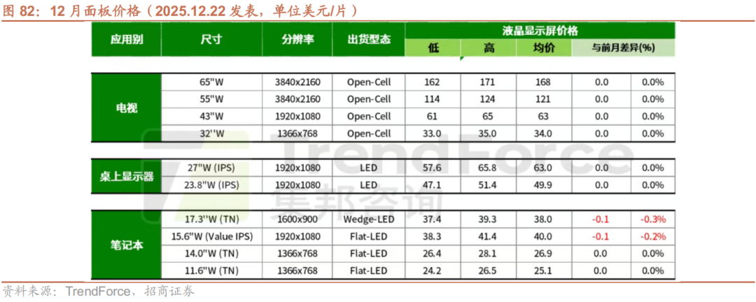 价格方面,12月电视面板价格有望提前止跌。据WitsView,1)电视面板:据WitsView,进入12月后,品牌客户一方面认为面板价格已在底部,另一方面也担心存储缺货与价格高涨问题将陆续扩及电视产品,且明年可能扩大发酵,因此持续将部分1Q26面板需求提前准备。目前电视面板需求仍维持稳定,面板厂的生产与稼动率仍持续维持在相对较高水准之下,面板价格因而获得一定的支撑基础。面板厂在需求维持不弱之下,也开始酝酿面板价格上涨的氛围,目前预计本月电视面板价格包括32”至65”将全面持平,同时在预估明年2月份农历新年及工作天数减少之下,部分需求会向1月份与3月份分流的前提下,1月份需求有机会仍维持不差,因此不排除1月份电视面板价格有机会开始上涨。2)显示器面板:第四季显示器面板需求虽偏弱,但仍有少数客户增加需求,且面板厂因主流显示器面板长期处于亏损状态,因此也不愿意在面板价格上有更多让步,品牌客户目前也可接受价格维持稳定,因此预估12月的显示器面板价格走势大都维持持平。同时,面板厂预期电视面板价格开始酝酿上涨的氛围下,对拉抬显示器面板价格走势亦有帮助,也同步开始酝酿显示器面板价格上涨的气氛,不过届时仍须视实际需求走势及买卖双方议价状况而定。3)笔电面板:进入12月份,笔记本电脑面板需求受到内存缺货与价格大幅上涨的冲击正逐渐显现,部分品牌希望可以赶在明年正式调涨整机出厂价格前,增加对中低阶机种出货,因此也带动笔记本电脑面板短期需求的增温。因为明年的需求受到内存影响下不确定性更高,因此就算目前部分面板需求增加,面板厂对面板价格的态度却更加放软,仍是希望以维持客户关系为优先考量,在此前提下,预估12月份的笔记本电脑面板价格除了TN机种价格持平外,其余IPS机种皆下跌0.1~0.2美元不等。且在1Q26需求更加疲弱之下,不排除笔记本电脑面板价格仍将承受调整压力。