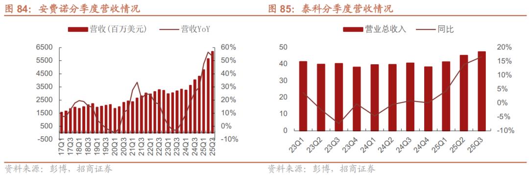 ①连接:海外连接大厂看好AI应用带动,其中安费诺预计25全年IT数通业务同比翻倍增长,泰科25财年AI营收同比增长三倍。1)安费诺:25Q3业绩再创历史新高,营收、利润率、订单均超预期,其中AI应用持续驱动IT数据通信业务翻倍增长。展望未来,公司预计25Q4营收60~61亿美元,同比 39%~41%;经调整摊薄每股收益0.89~0.91美元,同比 62%~65%。全年预计营收226.6~227.6亿美元,同比 49%~50%;经调整EPS 3.26~3.28美元,同比 72%~74%。2)泰科:25Q3(FY25Q4)营收47.5亿美元,同比 16.7%/环比 4.7%,调整后EPS 2.44 美元,同比 25%超出预期。其中公司在工业部门的AI和能源基础设施应用领域实现了显著增长,FY25财年AI相关收入超9亿美元,同比较FY24财年的3亿美元增长3倍。公司预计FY26Q1营收将达45亿美元,同比 11%。