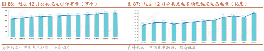 ②充电:国内电动汽车充电基础设施快速发展,1-10月桩车增量比1:1.9。25年10月国内充电基础设施持续增长,截至2025年10月底,我国电动汽车充电基础设施(枪)总数达到1864.5万个,同比增长54.0%;广东、浙江、江苏、山东、上海、河南、四川、安徽、湖北、河北TOP10地区建设的公共充电设施占比达66.1%。2025年1-10月,充电基础设施增量为582.7万个,同比上升77.2%,充电基础设施与新能源汽车继续快速增长。桩车增量比为1: 1.9,充电基础设施建设能够基本满足新能源汽车的快速发展。