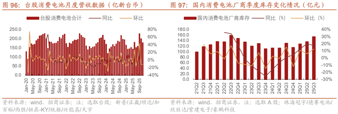 进入Q4,消费电池行业稼动率保持相对平稳,库存水平有所增加。从中国台湾消费电池厂商月度和季度数据来看,25Q3营收539亿新台币同比-0.6%环比 13.1%,M11营收178亿新台币同比-10%环比-11%,月度数据显示下半年拉货动能走弱。库存方面,国内消费电池厂商25Q3库存同比 17.5%环比 12.9%,同环比提升源于两重因素:1)上游原材料涨价,中下游备货需求有所增加并提前;2)为应对关税的不确定性,下游客户提前备货推动库存走高。