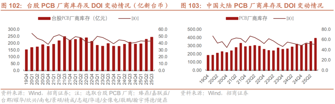 PCB库存方面,中国大陆及台股PCB厂商25Q3库存及周转均环比向上抬升,行业整体需求预期保持温和向上,其中AI领域需求非常旺盛。