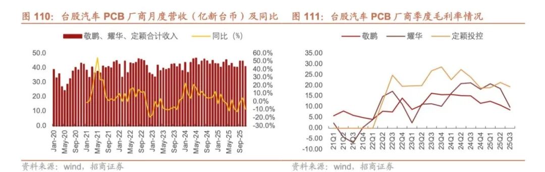 汽车板市场整体需求较弱,盈利能力恶化。汽车板厂敬鹏工业、定颖、耀华,其汽车板收入占比分别为80%/60 %/40 %,根据最新的月度收入情况来看,敬鹏、定颖、耀华1-11月的合计月度收入同比增速-2.9%。从毛利率角度,三家汽车板厂25年季度毛利率呈现环比下滑趋势。