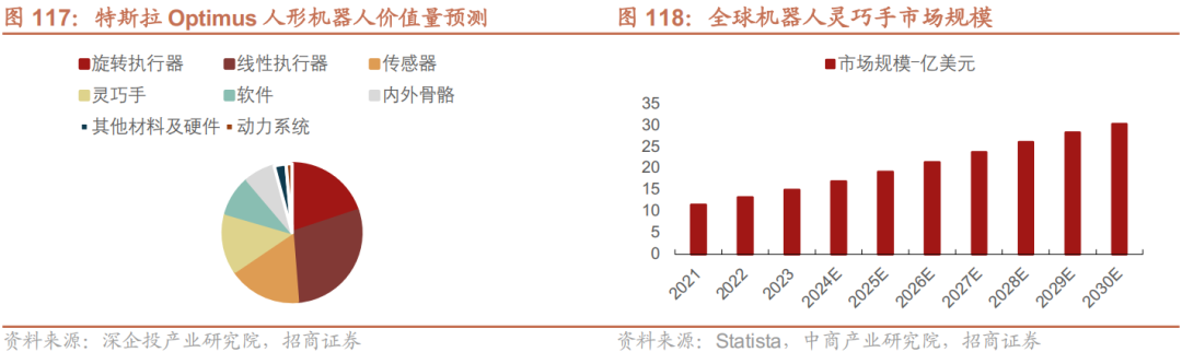 机器人方面,人形机器人星辰大海,灵巧手为产业链核心环节。伴随特斯拉Optimus人形机器人快速迭代掀起热潮,全球科技企业近年来纷纷加强人形机器人领域布局。人形机器人集成人工智能、高端制造、新材料等先进技术,有望成为继计算机、智能手机、新能源汽车后的颠覆性产品,发展潜力大、应用前景广。根据Markets and Markets,全球人形机器人市场规模预计将由2023年的18亿美元提升至2028年的138亿美元,CAGR约50.2%。远期来看,市场空间可达百万亿美元。灵巧手为人形机器人与外界交互的重要媒介,是机器人功能性的直接体现,其价值量占比高,预计特斯拉Optimus灵巧手价值量占比14.0%。根据中商产业研究院,2023年全球机器人灵巧手市场规模达15亿美元,2030年将突破30亿美元,CAGR约10.3%。