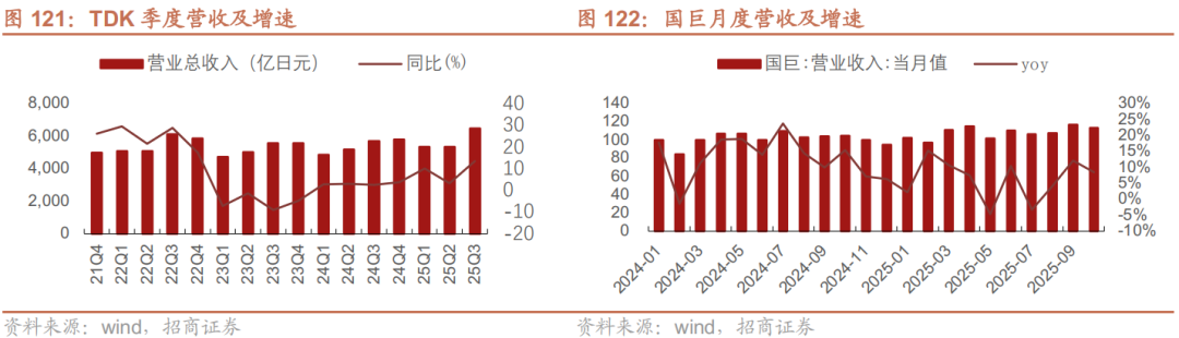 AI需求持续拉动行业需求,高端MLCC、钽电容等迎发展机遇。村田预计26财年来自AI服务器的需求将持续旺盛,受益于AI服务器及汽车市场带动,未来高容量MLCC需求将持续提升;目前MLCC整体组件库存已基本正常化,公司将以略高于每年10%的增长的速度增加设备安装。TDK FY26Q2业绩同比高增超市场预期,主要受益于ICT(信息通信技术)和 HDD(硬盘驱动器)市场的强劲需求带动。此外,伴随AI需求持续拉动行业需求,国巨(基美)宣布11月调涨钽电容部份规格产品价格,涨幅达20%~30%,范围由代理商延伸至直销客户,结合基美在钽电容市场的领先市场地位,预计此举有望助力国巨后续营收及利润增长。