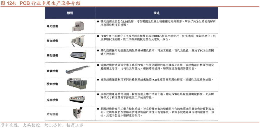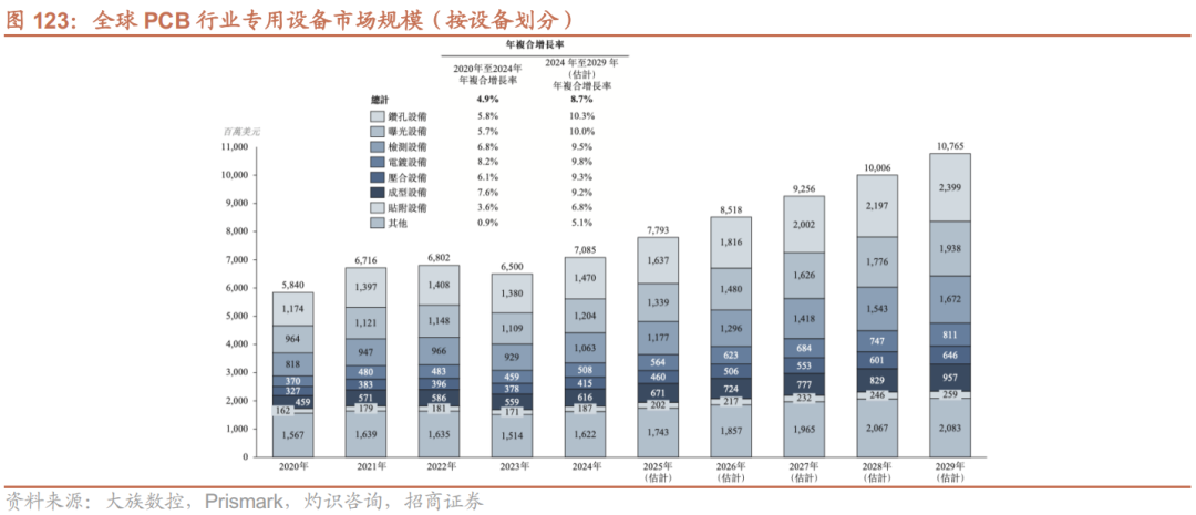 设备环节,建议优先关注具有景气与创新趋势的PCB设备链条。我们认为本轮扩产核心由AI算力PCB性能提升驱动,重点关注钻孔、曝光、电镀和钻针等环节,国内设备厂有望受益PCB扩产周期 高端设备国产加速替代的发展机遇。本轮扩产周期主要由算力PCB性能提升驱动,叠加PCB板厂在东南亚扩产贡献。算力PCB扩产以高阶HDI、高多层为主,相比中低端板子,层数增加、孔密度增加,对钻孔、曝光、电镀等设备有直接需求拉动,据Prismark,29年PCB专用设备市场规模将增至108亿美元,24-29年CAGR为8.7%,较20-23年的3.6%明显增长,其中钻孔、曝光、电镀设备增速高于平均增速,29年对应市场规模24/19/8亿美元,24-29年CAGR为10.3%/10.0%/9.8%。