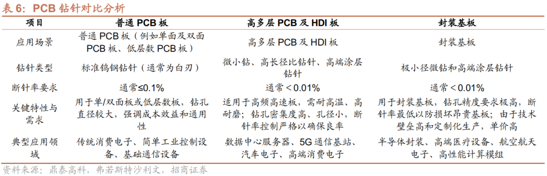 4)钻针:PCB钻针是PCB钻孔工序中的核心工具,其能力和品质直接决定了电路板的精度、可靠性与性能上限。高品质的钻针能够确保孔径精确、孔壁光滑,从而实现层间电气连接的稳定性和信号完整性。因此,若钻针品质不佳,将导致孔偏、断针或孔壁缺陷,进而影响层间导通,甚至造成板件报废,从根本上限制PCB向更高技术层级演进。下游多元化的应用场景也对钻针的技术参数提出了不同的需求。普通PCB板、高多层PCB/HDI板及IC载板三大应用场景对钻针的要求呈现显著差异。其中,算力PCB以高多层PCB、高阶HDI为主,性能要求更高,缩短钻针寿命并推升钻针消耗与需求,且基材迭代倒逼钻针升级,驱动钻针量价齐升。PCB钻针领域鼎泰高科份额领先,还包括中钨高新(金洲精工)、日本佑能、中国台湾尖点等。