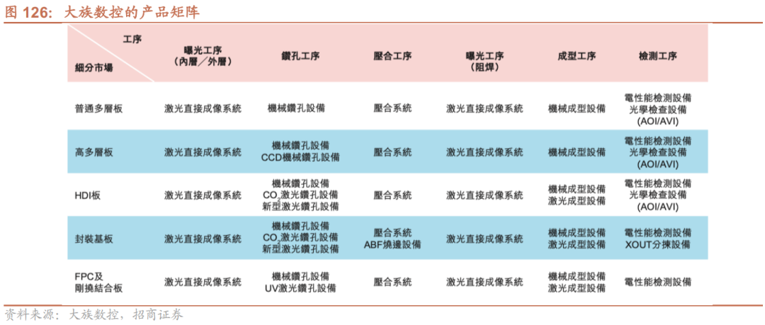 1)钻孔:高阶HDI、高多层项目投资占比最高环节,一般分别30%、20%左右,差异主要系随着HDI阶数升级,高阶HDI需多次激光打孔,激光钻孔设备需求提升。在机械钻孔领域,相比普通多层板,高多层板钻孔设备要求大幅提升,无论高速材料的变更,还是厚径比的上升,都导致机械钻孔机效率大幅降低,加工同样面积的AI PCB产品所需设备数量大幅增加。而信号完整的提高,背钻孔数提升的同时加工精度要求更高,对更高技术附加值的CCD机械钻孔机的需求量更多。大族数控占据机械钻孔领域全球绝大多数份额,其CCD背钻机优势突出,价值量较常规机械钻孔设备翻倍,海外包括德国Schmoll、中国台湾大量等。在激光钻孔领域,CO2激光钻孔日本三菱引领,产能偏紧,而大族超快激光产品技术领先,具有节省棕化/黑化&后处理除胶、盲孔加工品质更优、可加工扩层盲孔等优势,适用算力PCB领域SLP、CoWoP等新技术和M9/PTFE等新材料升级趋势,在良效率、综合成本等方面更优,大族超快激光钻孔设备进展顺利。