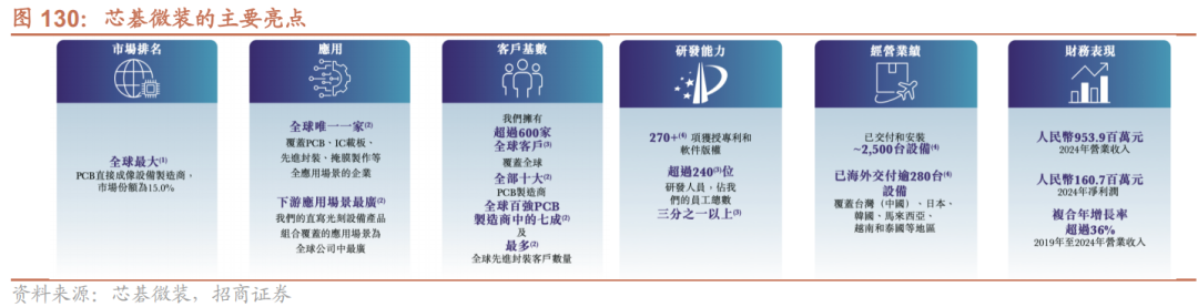 芯碁微装:PCB直接成像设备有望受益下游扩产,半导体直写光刻设备下游应用广泛。全球领先的PCB直接成像设备及半导体直写光刻设备供应商,根据灼识咨询,2024年公司以营收计在全球PCB直接成像设备行业中占据15.0%的市场份额,位列全球第一。2022年至2024年,公司PCB直接成像设备销售收入逐年增长,有望受益于PCB加速扩产。同时,公司半导体直写光刻设备适用于掩膜版制造、先进封装、IC载板、Micro/Mini LED及OLED面板生产,支持130nm至90nm制程节点。公司产品最小线宽可达350nm,优于传统PCB直接成像设备,满足更高精度需求。