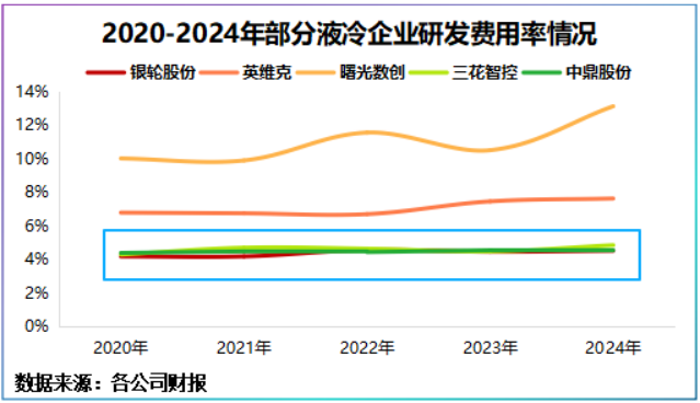 首先,研发投入上,2020-2024年,公司研发费用率为4.37%,与三花智控、中鼎股份齐平,却低于英维克、曙光数创。