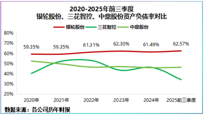 2020-2024年银轮股份资产负债率显著高出三花智控、中鼎股份10多个百分点,公司货币资金大体能覆盖长短期借款。