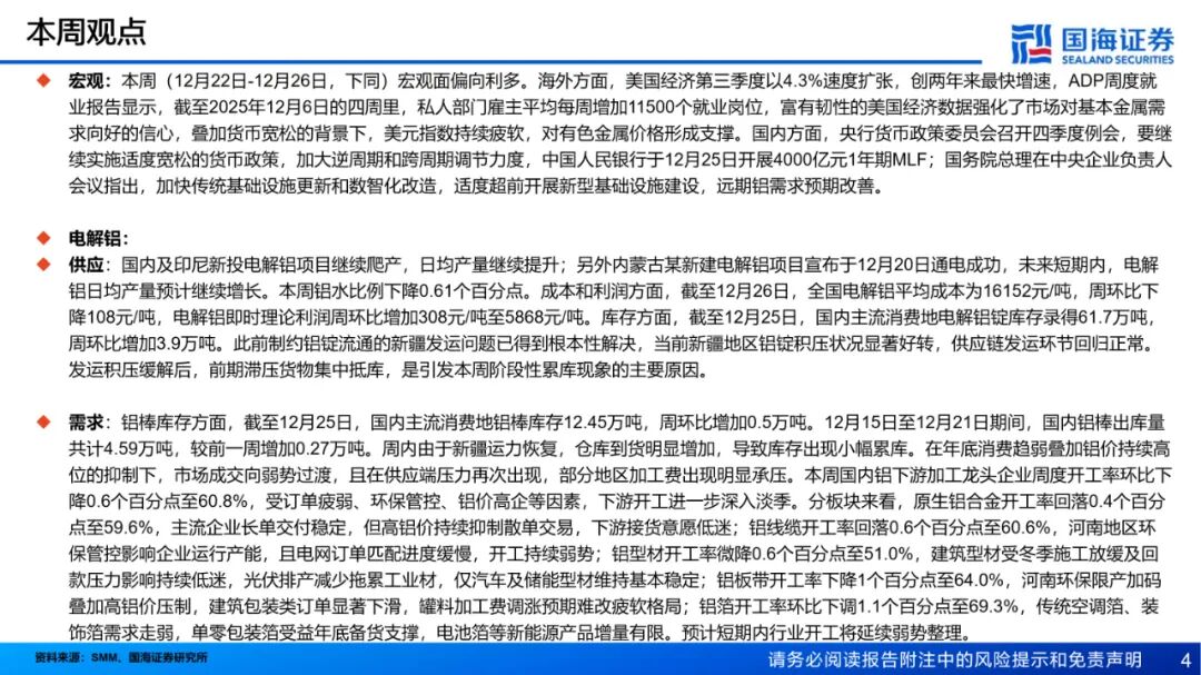宏观:本周(12月22日-12月26日,下同)宏观面偏向利多。海外方面,美国经济第三季度以4.3%速度扩张,创两年来最快增速,ADP周度就业报告显示,截至2025年12月6日的四周里,私人部门雇主平均每周增加11500个就业岗位,富有韧性的美国经济数据强化了市场对基本金属需求向好的信心,叠加货币宽松的背景下,美元指数持续疲软,对有色金属价格形成支撑。国内方面,央行货币政策委员会召开四季度例会,要继续实施适度宽松的货币政策,加大逆周期和跨周期调节力度,中国人民银行于12月25日开展4000亿元1年期MLF;国务院总理在中央企业负责人会议指出,加快传统基础设施更新和数智化改造,适度超前开展新型基础设施建设,远期铝需求预期改善。