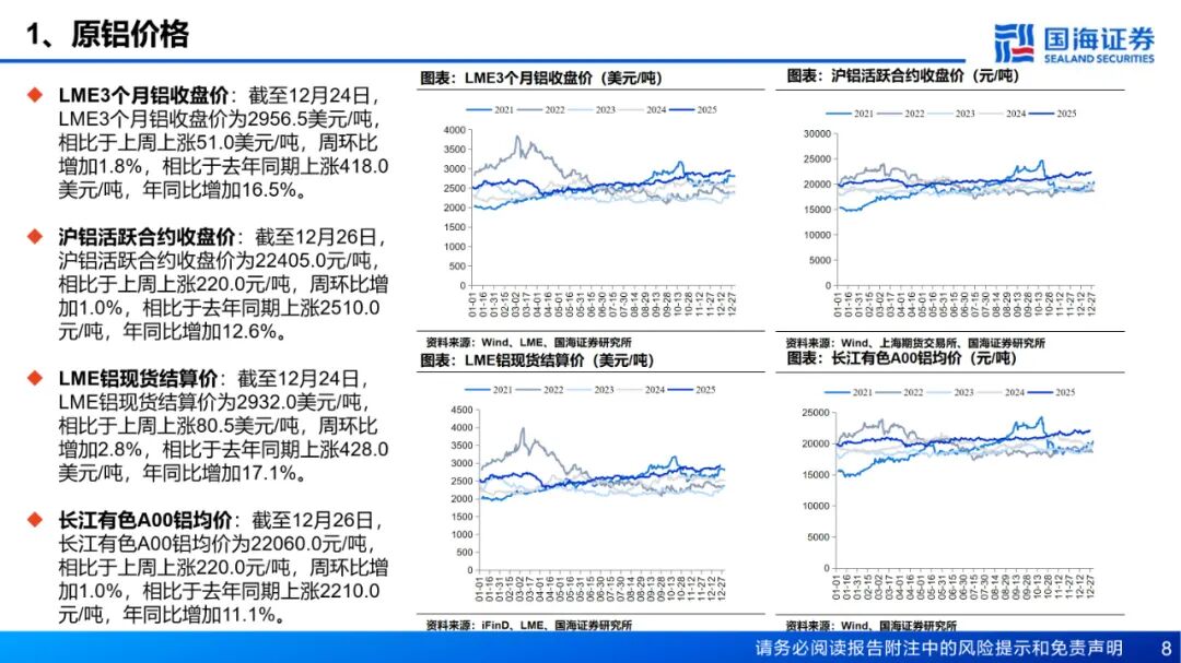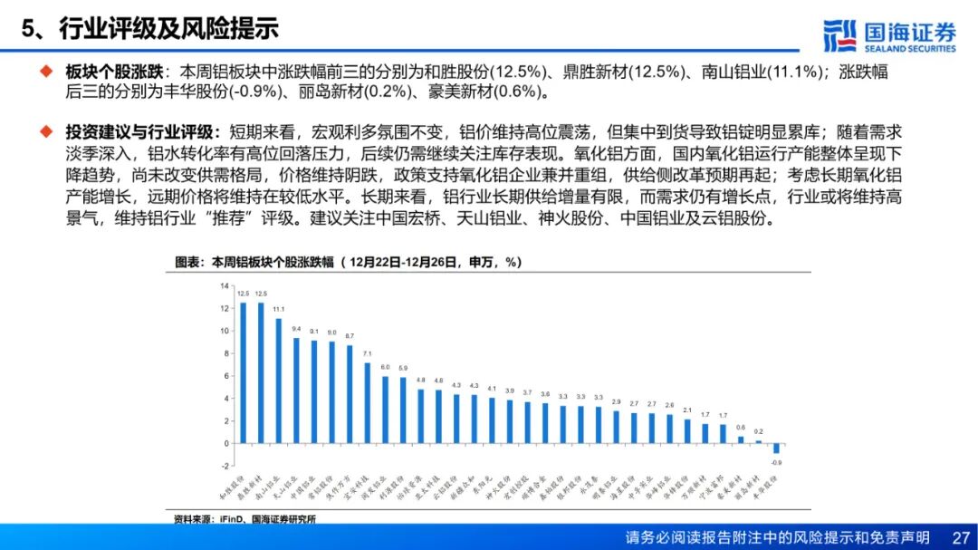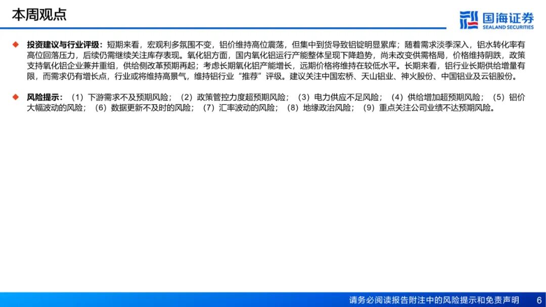 风险提示:(1)下游需求不及预期风险;(2)政策管控力度超预期风险;(3)电力供应不足风险;(4)供给增加超预期风险;(5)铝价大幅波动的风险;(6)数据更新不及时的风险;(7)汇率波动的风险;(8)地缘政治风险;(9)重点关注公司业绩不达预期风险。
