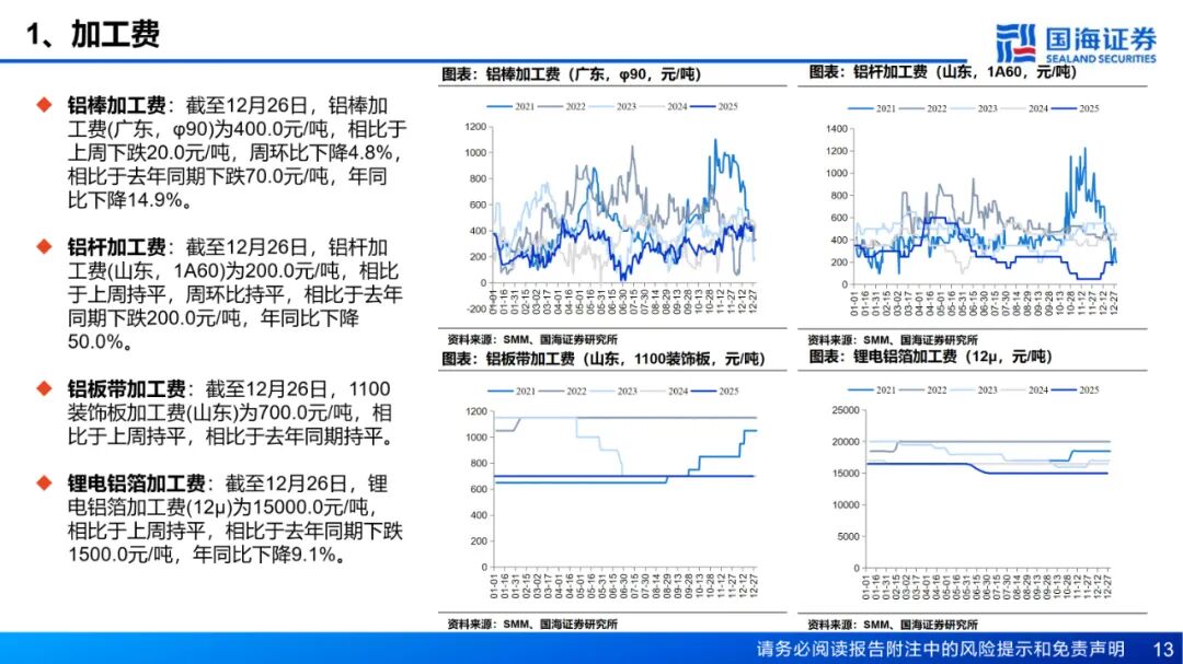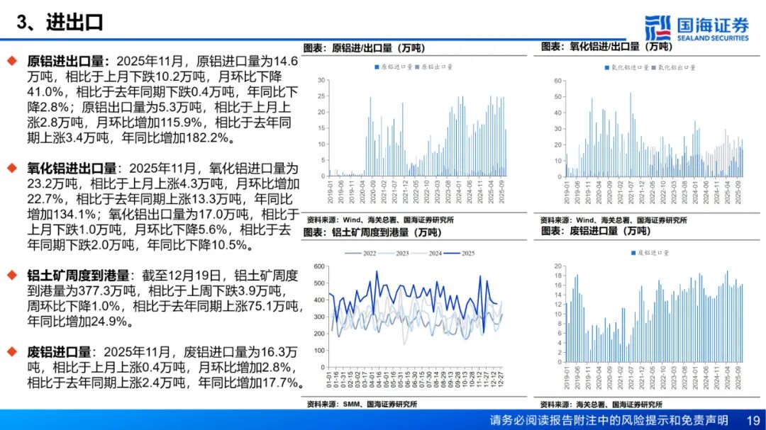 需求:铝棒库存方面,截至12月25日,国内主流消费地铝棒库存12.45万吨,周环比增加0.5万吨。12月15日至12月21日期间,国内铝棒出库量共计4.59万吨,较前一周增加0.27万吨。周内由于新疆运力恢复,仓库到货明显增加,导致库存出现小幅累库。在年底消费趋弱叠加铝价持续高位的抑制下,市场成交向弱势过渡,且在供应端压力再次出现,部分地区加工费出现明显承压。本周国内铝下游加工龙头企业周度开工率环比下降0.6个百分点至60.8%,受订单疲弱、环保管控、铝价高企等因素,下游开工进一步深入淡季。分板块来看,原生铝合金开工率回落0.4个百分点至59.6%,主流企业长单交付稳定,但高铝价持续抑制散单交易,下游接货意愿低迷;铝线缆开工率回落0.6个百分点至60.6%,河南地区环保管控影响企业运行产能,且电网订单匹配进度缓慢,开工持续弱势;铝型材开工率微降0.6个百分点至51.0%,建筑型材受冬季施工放缓及回款压力影响持续低迷,光伏排产减少拖累工业材,仅汽车及储能型材维持基本稳定;铝板带开工率下降1个百分点至64.0%,河南环保限产加码叠加高铝价压制,建筑包装类订单显著下滑,罐料加工费调涨预期难改疲软格局;铝箔开工率环比下调1.1个百分点至69.3%,传统空调箔、装饰箔需求走弱,单零包装箔受益年底备货支撑,电池箔等新能源产品增量有限。预计短期内行业开工将延续弱势整理。铝土矿:本周国产矿供应偏紧格局延续。当前河南地区环保限产政策对铝土矿生产影响较为有限,仅部分矿山停产。当前矿山供应仍不稳定,矿山完全恢复生产或需等到两会之后。整体来看,尽管当前国产矿供应压力仍存,但铝土矿绝对库存仍处高位,据SMM数据,截至12月25日,氧化铝厂铝土矿库存环比上周增加86.52万吨至5541.10万吨,叠加氧化铝价格持续走低,氧化铝厂当前采购铝土矿意愿偏低,预计国产铝土矿价格仍有下跌空间。进口矿方面,截至12月19日,几内亚主要港口铝土矿周度出港总量为376.48万吨,较前一周减少15.96万吨,出港量仍在高位,几内亚铝土矿发运稳定;澳大利亚主要港口铝土矿周度出港总量为117.55万吨,较前一周增加32.69万吨。截至12月19日,我国铝土矿到港量为377.33万吨,较前一周减少3.92万吨。价格方面,近期海外铝土矿市场成交较为清淡,几内亚某大型矿山2026年1季度长单价较上一季度下调7.5美元至66.5美元/吨,降幅明显,但根据航运时间来看,该价格的铝土矿实际到港时间预计为2026年2月中下旬。当前几内亚铝土矿CIF意向成交价仍为67-70美元/吨。截至12月25日,SMM几内亚铝土矿CIF均价报68.5美元/吨,周环比下跌2美元/吨。后续需密切关注几内亚大选临近可能带来的政策不确定性。