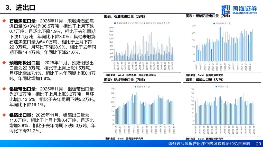 预焙阳极:预焙阳极价格持平,石油焦价格下跌。截至12月26日,预焙阳极均价为6186.5元/吨,相比于上周持平;中硫石油焦均价为3600.0元/吨,相比于上周下跌75.0元/吨,周环比下降2.0%。