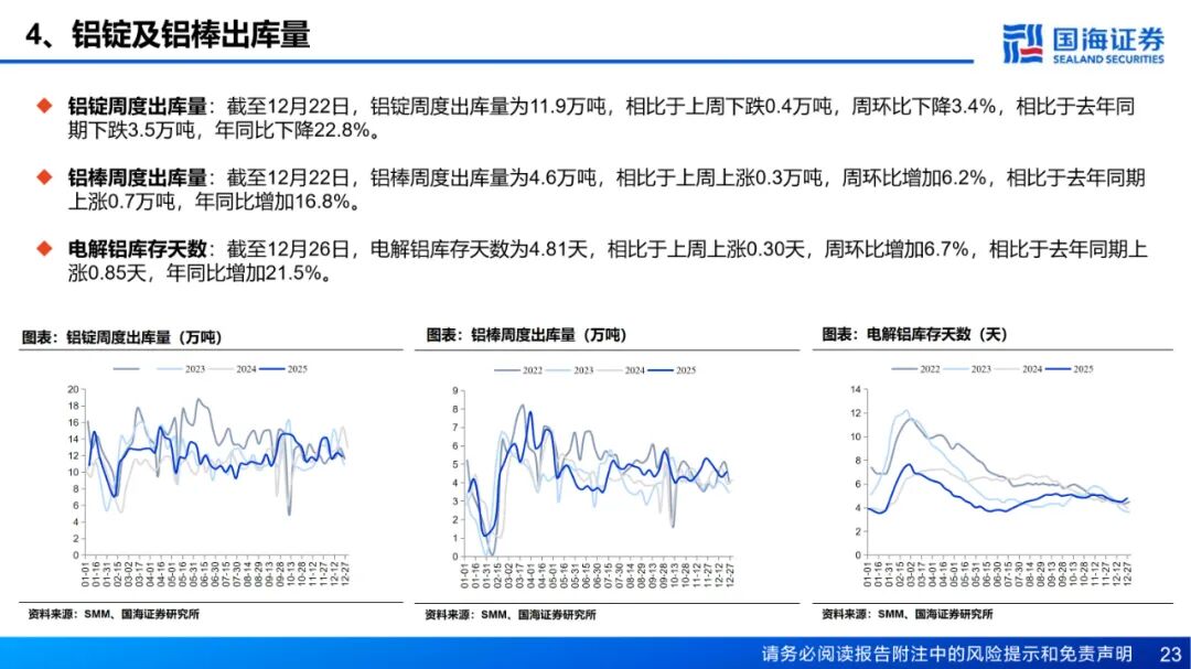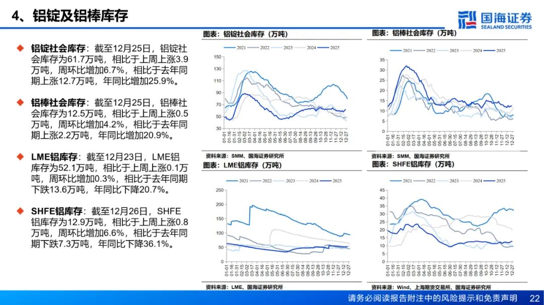供应:国内及印尼新投电解铝项目继续爬产,日均产量继续提升;另外内蒙古某新建电解铝项目宣布于12月20日通电成功,未来短期内,电解铝日均产量预计继续增长。本周铝水比例下降0.61个百分点。成本和利润方面,截至12月26日,全国电解铝平均成本为16152元/吨,周环比下降108元/吨,电解铝即时理论利润周环比增加308元/吨至5868元/吨。库存方面,截至12月25日,国内主流消费地电解铝锭库存录得61.7万吨,周环比增加3.9万吨。此前制约铝锭流通的新疆发运问题已得到根本性解决,当前新疆地区铝锭积压状况显著好转,供应链发运环节回归正常。发运积压缓解后,前期滞压货物集中抵库,是引发本周阶段性累库现象的主要原因。