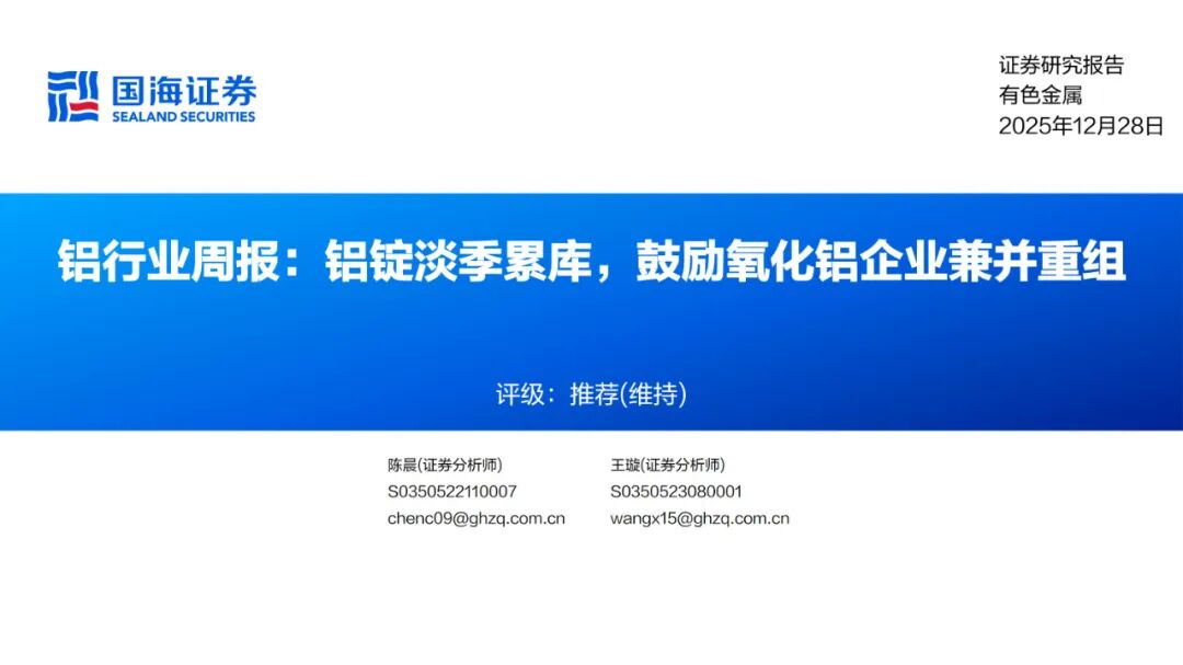【国海能源开采】铝行业周报:铝锭淡季累库,鼓励氧化铝企业兼并重组