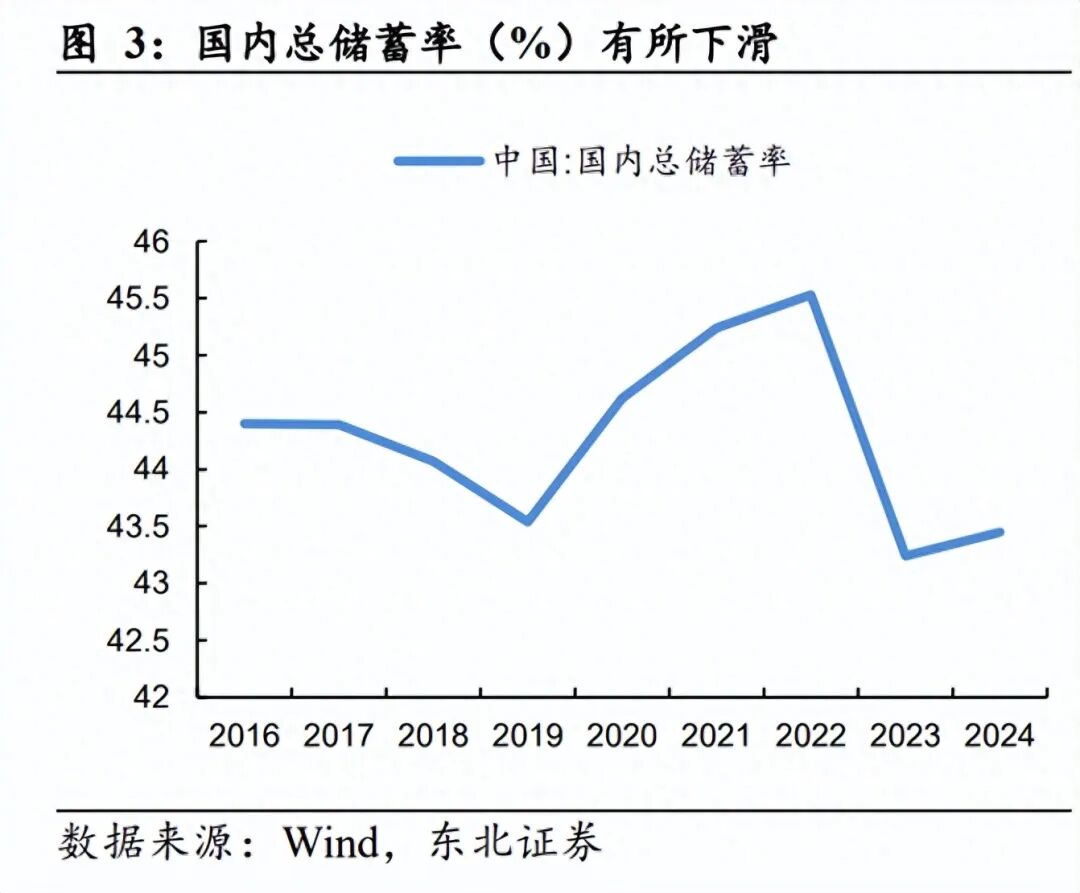 居民资产负债表:房地产仍为主力,投资意愿回升。从居民资产负债表角度来看, 国内储蓄率下降,虽然新增储蓄意愿仍处于高位,但是已经处于顶部,出现了单季 度的环比下降。