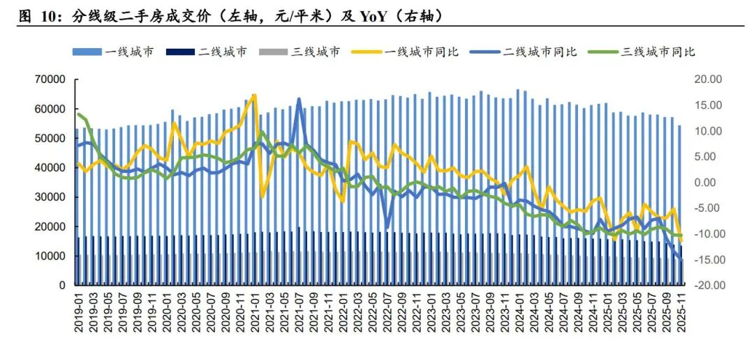 二手房方面,同样从量价两个角度来看: 量:成交量恢复后再次出现下跌。从北上深三城数据来看,2024 年 12 月为疫情后 二手房成交量巅峰,目前二手房成交量再次出现下跌,但市场活跃度整体依然相比 于 23Q4 和 24H1 较高。