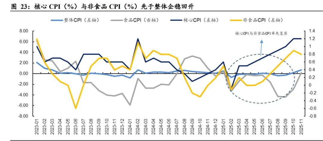 CPI 分结构方面,非食品及核心 CPI 走出持续环比改善。在 CPI 持续低迷的大背景 下,非食品 CPI 及核心 CPI 均走出了止跌回升,其中,2025 年 10 月核心 CPI 同比 增长达 1.2%,追平 2024 年 2 月因低基数影响下的水平。
