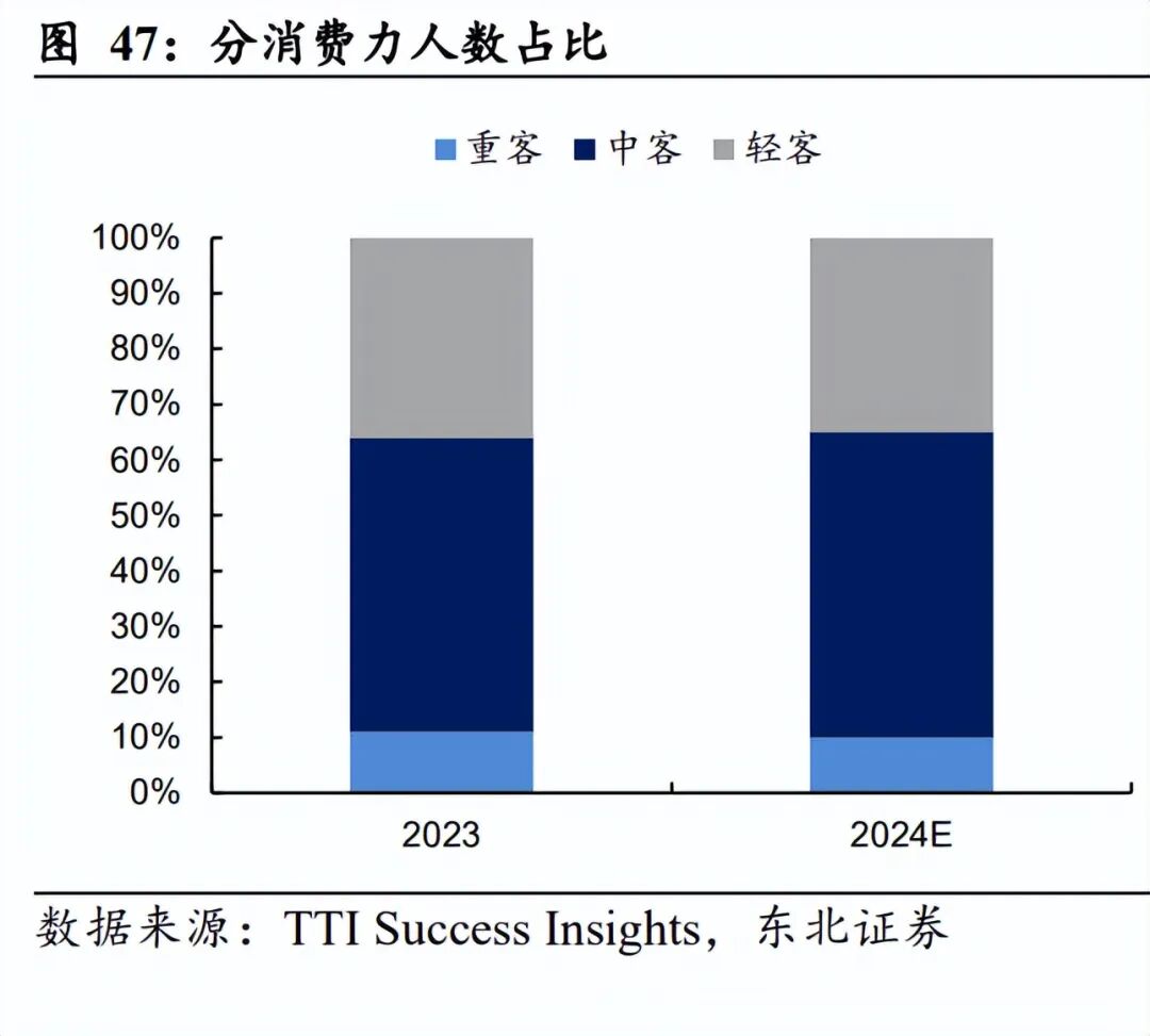 分地区来看,亚太及中国表现出区别于友商的增长韧性。2023 年 Q3 以来,爱马仕 整体亚太(除日本)增速有所下滑,但整体表现出正增长,在奢侈品品牌中一枝独 秀。究其原因,我们发现,23Q3 及 2024 年初,爱马仕更低价的丝巾、小皮具等入 门类产品消费者减少,但顶级客户的购买力仍然持续。我们认为,顶级客户的消费 能力在需求不足时更具韧性,在财富效应凸显的当下,也有望加速复苏。