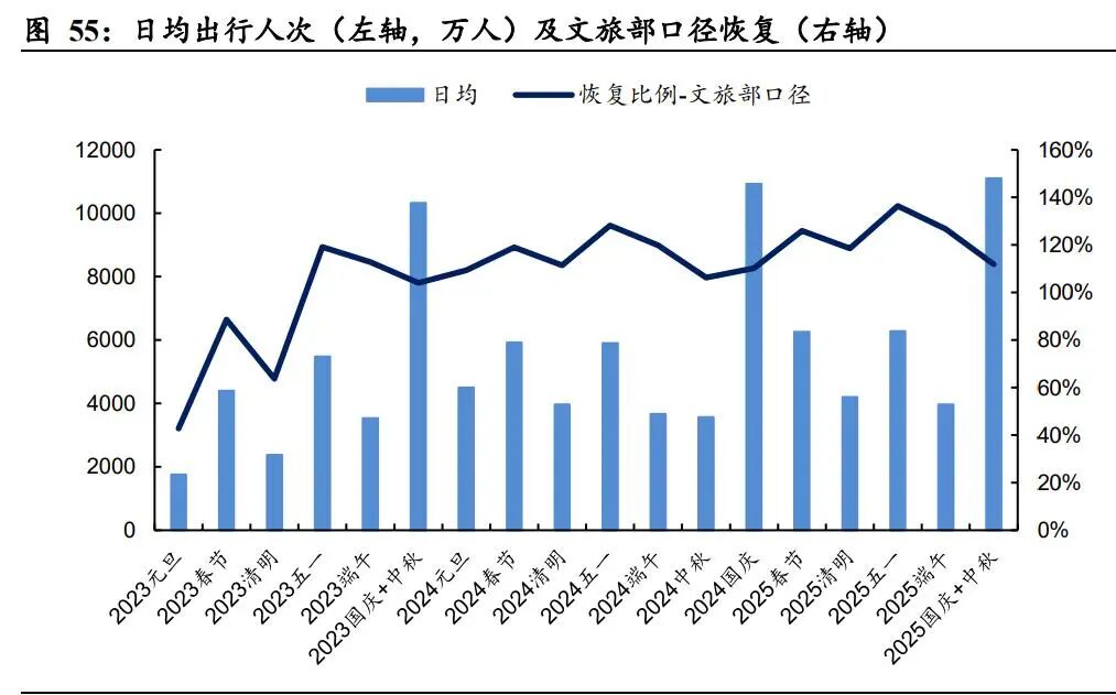 从出行角度验证,铁路长期温和恢复,民航在 2025 年中秋 国庆假期首次恢复超过 铁路,居民出行方式逐步倾向于高客单价选择。 铁路:2023 年五一,铁路恢复至 2019 年同期以上,之后逐步表现稳定,2025 年春 节/清明/五一/端午/中秋 国庆铁路日均发送旅客量相比于 2019 年分别增长