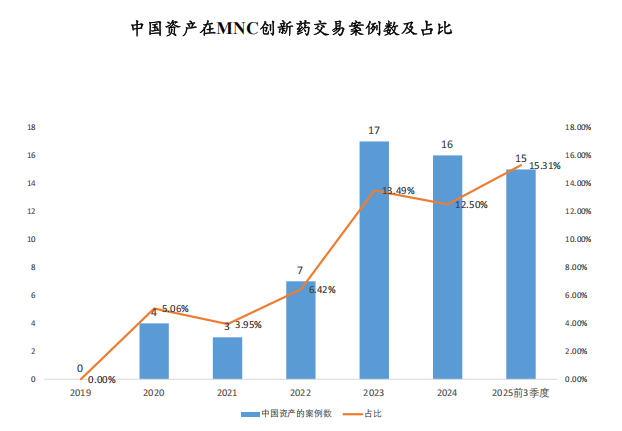 从BD的特点来看,License-out项目日益前移。2024年早期(临床前 I-II期)项目占比高达87%,其中临床前占64%,显示国际MNC对中国早期资产的信任度显著提升。