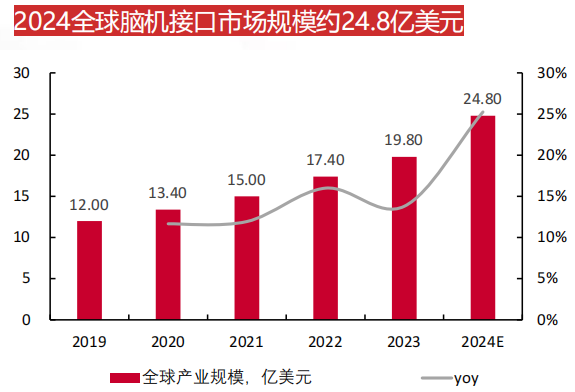 创新:脑机接口——国家战略下的千亿级新赛道。中邮证券研究资料显示,据Grand View Research统计数据,全球脑机接口市场规模由2019年的12亿美元,增长至2023年近20亿美元,2019-2023年复合增长率超13%。上海证券重点提示了脑机接口(BCI)的长期战略价值,麦肯锡预测到2030–2040年,全球脑机接口在医疗领域的潜在市场规模达400–1450亿美元。