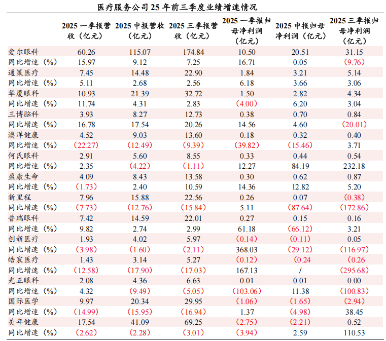 医疗服务板块2025年的表现并不亮眼,从2025年前三季度的业绩来看,虽然不少公司收入端已经逐步回暖,如爱尔眼科,公司前三季度实现营收174.84亿元,同比增长7.25%,但是归母净利润端仍然承压,前三季度归母净利润为31.15亿元,同比下滑9.76%。