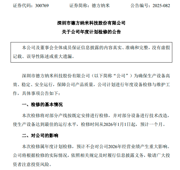 据储能知家获悉,12月26日,在湖南裕能、万润新能双双公告,拟对部分产线减产检修后,德方纳米发布公告,为确保生产设备高效、稳定、安全运行,保障公司产品质量,计划进行年度设备检修与维护工作,检修时间从2026年1月1日起,预计一个月,本次检修属年度计划检修。