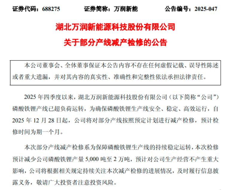 万润新能公告,自2025年12月28日起,公司将对部分产线按照预定计划进行减产检修,预计检修时间为期一个月。本次部分产线减产检修系为保障磷酸铁锂生产线的持续稳定运转,本次检修预计减少公司磷酸铁锂产量5000吨至2万吨,预计对公司生产经营不产生重大影响。