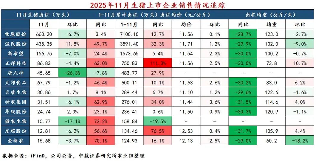 11月猪企销售下降:量上,从已公告12家猪企销售数据看,11月生猪销量共计1583.94万头,环比降2.45%。3家猪企月出栏环比上涨,其中,温氏股份、华统股份11月出栏环比涨幅11.8%、2.0%。价上,11月全国生猪均价有所上升。从已公告12家猪企销售数据看,11月生猪出栏均价为11.67元/公斤,环比涨1.71%。出栏均重上,11月生猪出栏均重有所下降。从已公告12家猪企销售数据看,11月生猪出栏均重为100.62公斤,环比下降1.00%。其中,正邦科技、天邦食品11月生猪出栏均重环比涨幅10.7%、6.2%。养殖利润上,据iFinD数据,截至12月26日,自繁自养和外购仔猪养殖利润分别为-130.11元/头,-162.80元/头。