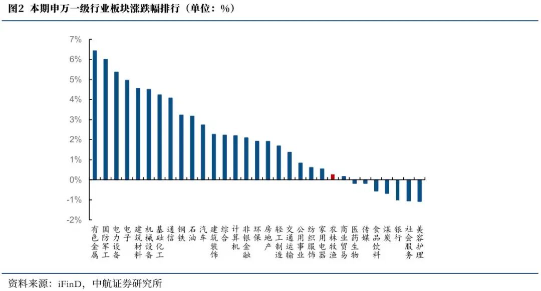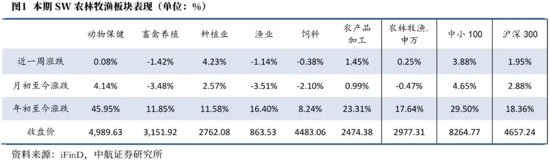 本期(2025.12.20-2025.12.27)上证综指收于3963.68,本期涨1.88%;沪深300指数收于4657.24,本期涨1.95%;本期申万农林牧渔行业指数收于2977.31,本期涨0.25%,在申万31个一级行业板块中涨跌幅排名23位,二级板块动物保健、畜禽养殖、种植业、渔业、饲料、农产品加工的周涨跌幅分别为0.08%、-1.42%、4.23%、-1.14%、-0.38%、1.45%。