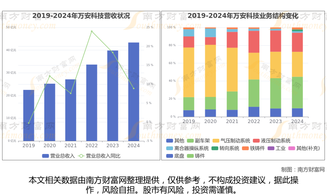 (如上图)2024年万安科技公司营业总收入43.36亿,同比增长8.87%,近五年复合增长率为14.51%。