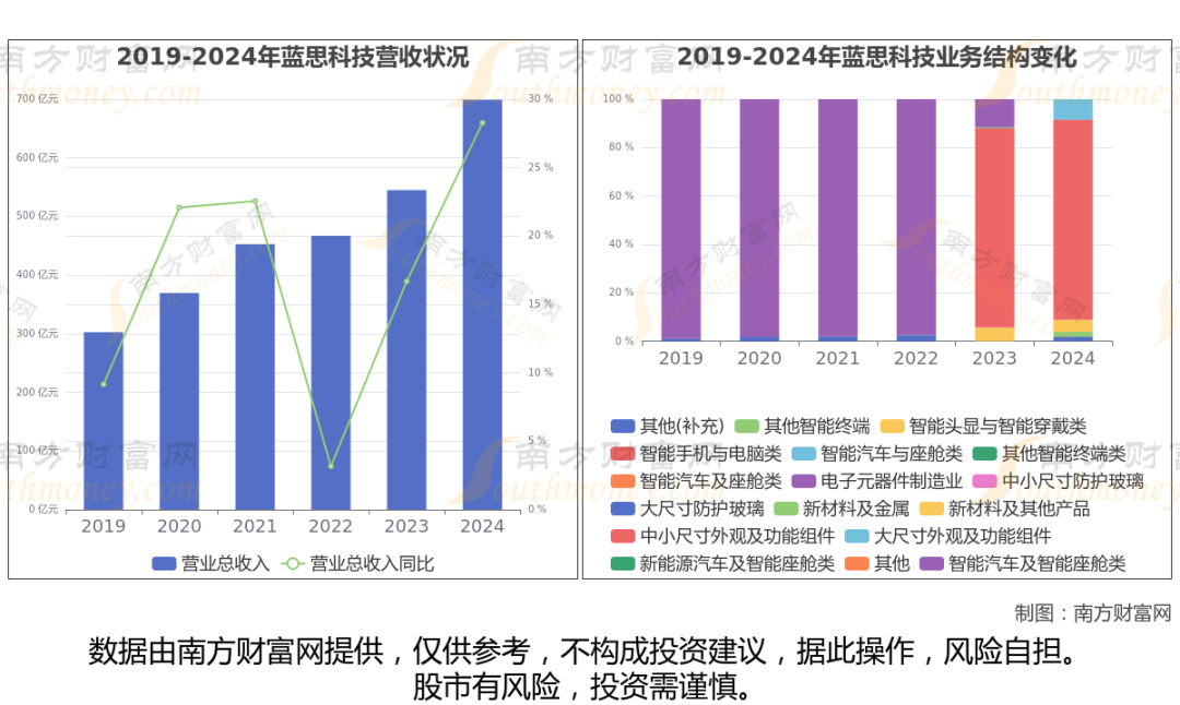 根据公司年度数据显示(如上图),2024年,蓝思科技实现营业总收入698.97亿,同比增长28.27%,近5年复合年增长率17.29%。