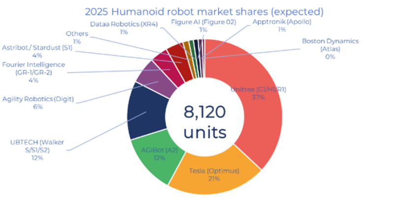 市场瞬息万变,《2026年人形机器人报告》中提及的人形机器人制造商超过60家。其中,超过一半是中国企业。因此,排名前五的厂商中有三家是中国企业也就不足为奇了。而中国企业宇树科技(Unitree)以37%的市场份额领跑市场。