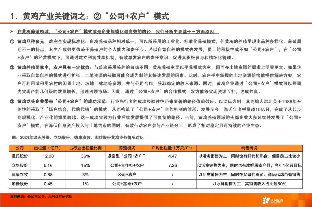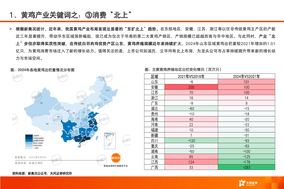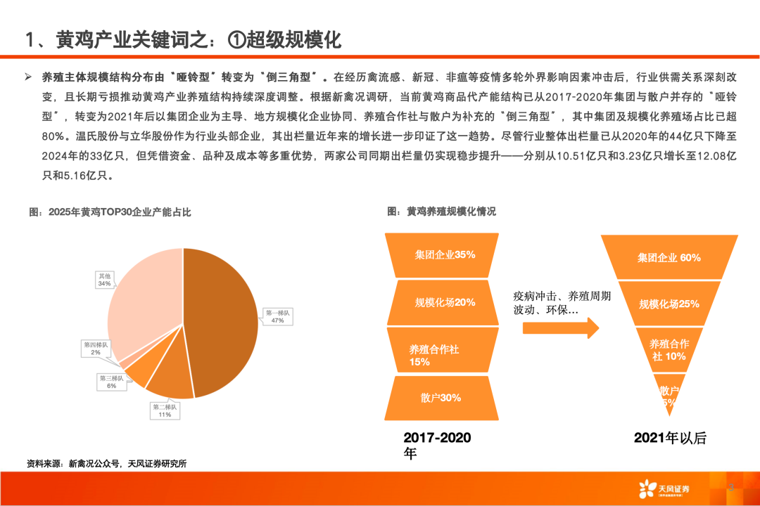受内外部环境的影响,黄鸡产业在过往周期中产生了深刻变革,可总结为以下三个关键趋势:1)超级规模化:根据新禽况调研,黄鸡养殖格局已从过去集团与散户并重的“哑铃形”,深度调整为以集团及规模化企业为主导的“倒三角”结构(占比超过80%),行业正进入以全产业链与品质化为核心的寡头竞争阶段。2)公司 农户:基于黄鸡产品多样化、养殖周期差异、土地资源需求以及行业标杆形成的示范效应,“公司 农户”模式成为黄鸡规模化养殖最高效的路径,目前温氏、立华、德康等头部企业均以此模式为主要发展方向。3)消费北上:黄鸡消费逐步打破传统区域限制,养殖区域成功向山东等北方传统白羽肉鸡产区扩张。北上布局为黄鸡产业打开了新的市场增长空间。