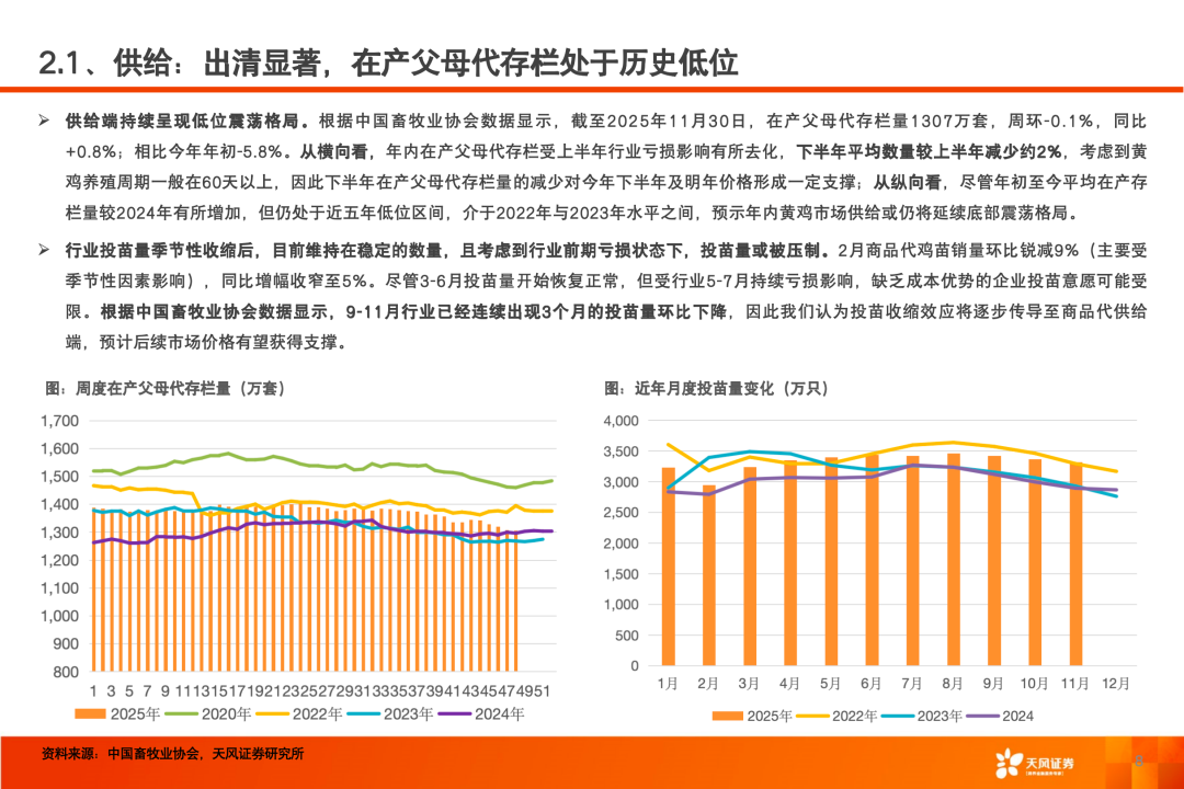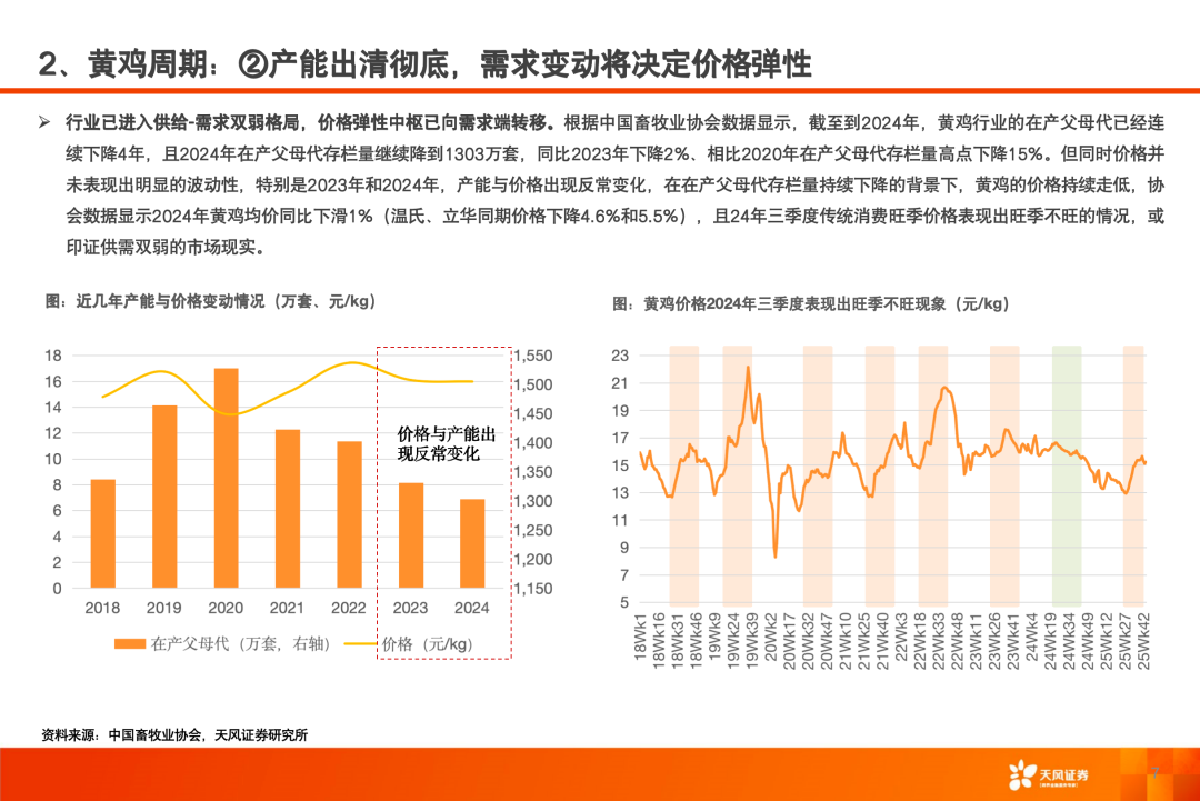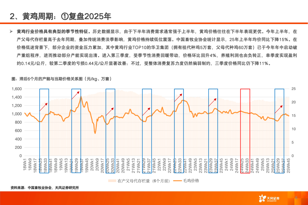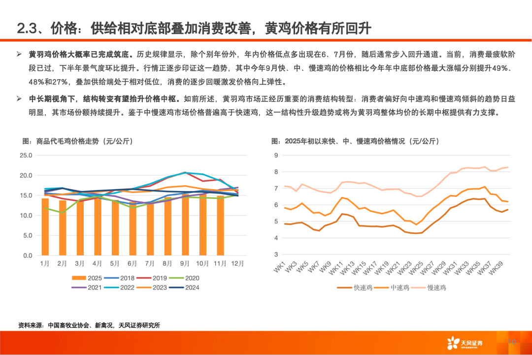 1)复盘:黄鸡价格呈现典型季节性特征,下半年表现通常更优。今年上半年因供给偏多及消费淡季,价格低位震荡,均价同比下跌15%。在价格低迷背景下,部分企业如华卫集团已进入破产重组,加速产能出清。第三季度随消费季节性回暖,价格环比回升4%,行业养殖利润由二季度的亏损0.44元/公斤转为盈利约0.14元/公斤。三、个股:价格有支撑,黄鸡龙头稳健成长