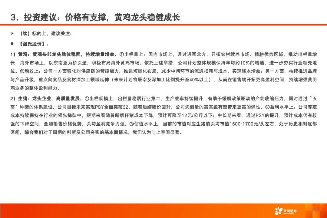 基于对行业发展趋势的分析,我们重点看好价格支撑下,黄鸡龙头稳健成长,市占率不断提升。标的上建议关注:【立华股份】(①黄鸡:育种优势推动全国化布局,有效支撑今明两年出栏量增长8%-10%的公司目标,巩固行业第二地位;规模化运营带来显著成本优势,较行业长期保持0-1元/公斤超额利润,实现高效扩张。②生猪:尚未充分定价,头均盈利水平竞争力强,同时估值较可比公司有差距)、【温氏股份】(①黄鸡:黄鸡龙头,通过国内深耕与海外拓展实现年均约10%的出栏量增长;依托供应链短链优化 产品深加工延伸,持续提升盈利能力。②生猪:稳居行业第二且高质量发展,短期&中长期成本下降均有明确路劲,叠加销价优势,头均盈利竞争力强)。