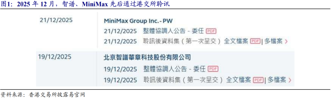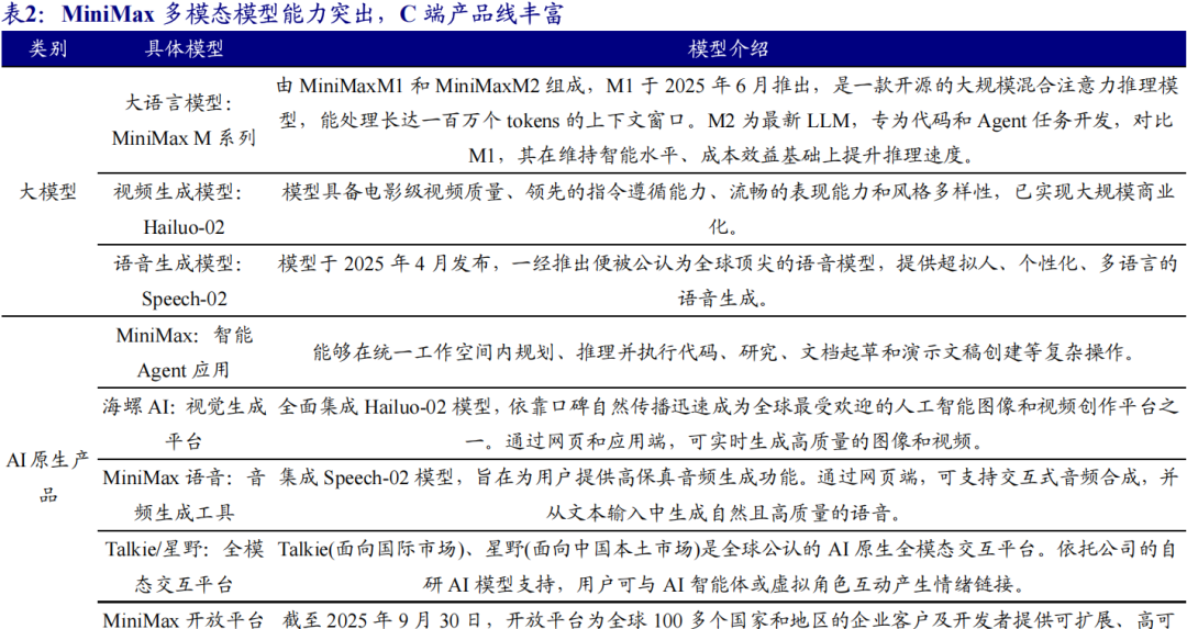 国内大模型企业智谱和Minimax(稀宇科技)分别于12月19日和12月21日通过港交所聆讯并披露招股说明书,开启近几年初创的大模型企业IPO征程。根据招股书,智谱和Minimax两家公司创始人及核心管理团队均有深厚的技术背景,智谱在模型推理、编程及Agent方面能力突出,并主攻B端市场,通过B端客户产品渗透C端,2025年11月,智谱日均token消耗量为4.2万亿,截至2025年12月,智谱系列模型已为超12000家机构客户、超8000万台设备提供支持,代表客户包括三星、小鹏等;Minimax多模态模型能力突出,产品线丰富,并主攻C端市场,其AI原生产品包括Agent应用MiniMax、视觉生成平台海螺AI、虚拟陪伴平台Talkie/星野等,2025年1-9月,MiniMax AI原生产品用户量2.12亿,平均月活跃用户数约2762万,付费用户数约177万,每位付费用户平均支出15美元。两家大模型公司都在经历高速成长且积极出海,2025H1智谱实现营业收入1.91亿元(同比 325%),境外收入占比提升至11.6%;2025Q1-3,MiniMax实现营业收入5344万美元(同比 175%),亚太以外地区收入占比升至39% 。我们认为,智谱、Minimax等初创大模型公司相继推进IPO,或借资本市场大幅提升融资能力、补充资金,从而加大对模型研发的投入,提升多模态/推理/Agent性能,拉动训练、推理端算力需求,并加速全球商业化,而近期阿里万相2.6系列模型、腾讯混元世界模型1.5、豆包大模型1.8及音视频模型Seedance1.5 Pro等国内互联网巨头多模态大模型的陆续发布,或进一步加速多模态AI应用在B、C端商业化进程,拉动模型训练及应用推理算力需求。我们建议继续布局多模态AI应用及推理算力方向:(1)AI视频:重点推荐快手、上海电影、芒果超媒、阅文集团,受益标的包括华策影视、中文在线、捷成股份、光线传媒等;(2)AI音乐:重点推荐盛天网络、网易云音乐;(3)AI设计:受益标的包括美图公司、视觉中国;(4)推理算力:重点推荐顺网科技。