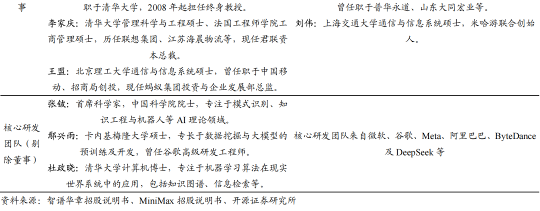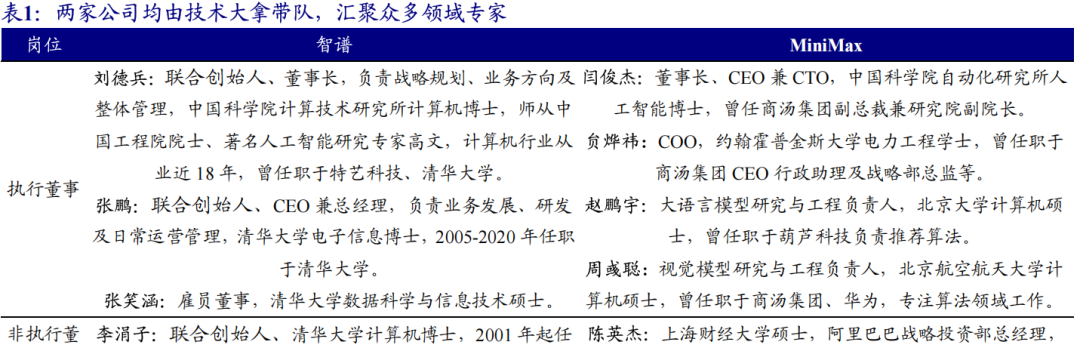 两家公司均由技术大拿带队,汇聚众多领域专家。智谱脱胎于清华大学计算机系知识工程实验室,与该实验室保持密切且持久的合作伙伴关系,与清华大学及北京大学共建基座模型北京重点实验室推动相关研究。董事长刘德兵博士师从中国工程院院士、著名人工智能研究专家高文。MiniMax董事长闫俊杰是中国科学院自动化研究所人工智能博士,曾任商汤集团副总裁兼研究院副院长。团队研发负责人均为算法领域专家,核心研发团队来自微软、谷歌、Meta、阿里巴巴等海内外科技巨头。