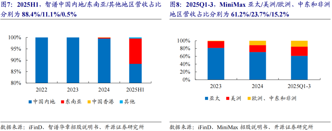 MiniMax海外营收占比高,智谱已启动出海。2023年,MiniMax亚太以外地区营收占比超18%,2025Q1-3,亚太以外地区营收占比进一步提升至39%。2024年,智谱境外营收占比0.5%,2025H1,境外营收占比提升至11.6%。对比两者,我们认为海外营收占比差异主要系智谱早期主攻B端市场,适合由商务关系相对简单且空间广阔的本土出发,而MiniMax早期主攻C端市场,适合从用户付费习惯成熟的海外起步。
