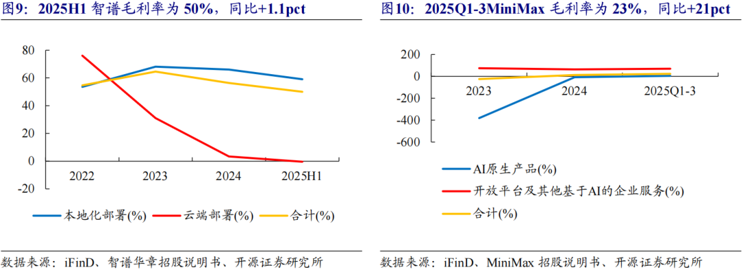 B端业务毛利率相对较高,模型智能水平、AI基础设施效率及产品商业化是C端毛利率提升的关键驱动力。2025H1,智谱毛利率为50%,同比 1.1pct,其中本地化部署毛利率59.1%,云端部署毛利率-0.4%,本地化部署毛利率较高主要系客户以对数据安全、监管合规及定制化服务要求高的大型集团为主,该类客户付费意愿强且无需公司负担推理算力成本。2025Q1-3,MiniMax毛利率为23%,同比 21pct,其中AI原生产品毛利率4.7%,开放平台及其他基于AI的企业服务毛利率69.4%。2024年AI原生产品毛利率提升主要系用户规模扩大及新货币化功能的推出。