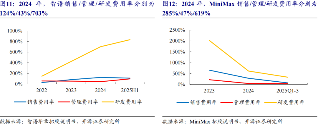 两家大厂均维持高强度研发投入,MiniMax整体费用率逐步下降。2024年智谱/MiniMax研发费用率分别为703%/619%,两家大厂均维持高于营收的研发投入,主要系用于人才团队构建及模型训练支出。MiniMax营收规模扩大显著摊薄费用投入,2025Q1-3销售/管理/研发费率分别为74%/41%/337%。